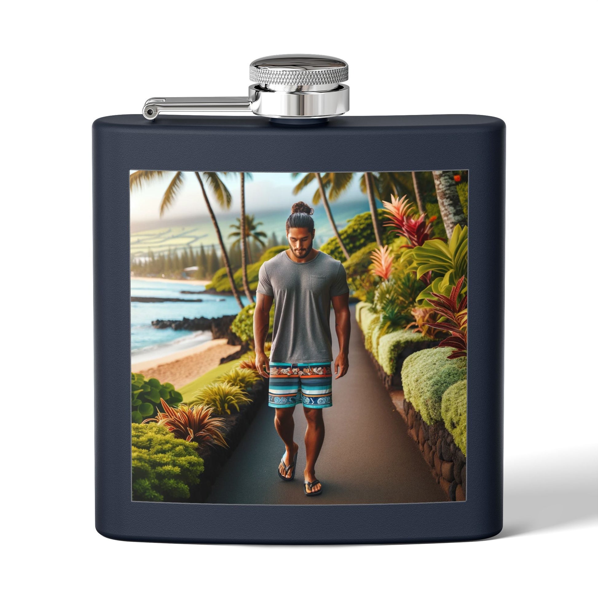 A compact stainless steel flask designed for days when you want your drink close at hand. The 6oz size slips into a pocket or small bag, while the double-wall construction keeps contents at a steady temperature. The powder-coated surface and UV DTF printed design resist wear so the artwork—sunlit beach path, lush tropical foliage, and a relaxed walker—stays vibrant. The screw-top lid with a secure latch seals tightly to prevent spills. Hand wash to protect the finish and print. This flask fits into laid-back beach strolls, weekend getaways, and quiet moments by the shore, offering a durable, travel-ready way to carry a favorite sip.